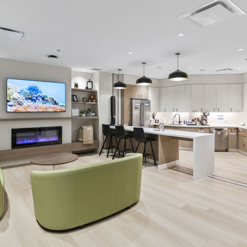 The room is equipped with complimentary snacks and refreshments as well as a kitchenette, dining area and laundry facilities. It also includes a cozy sitting area with television and fireplace, and a space for computer access with internet. We also offer various programming including crafts, books, and toys for children.